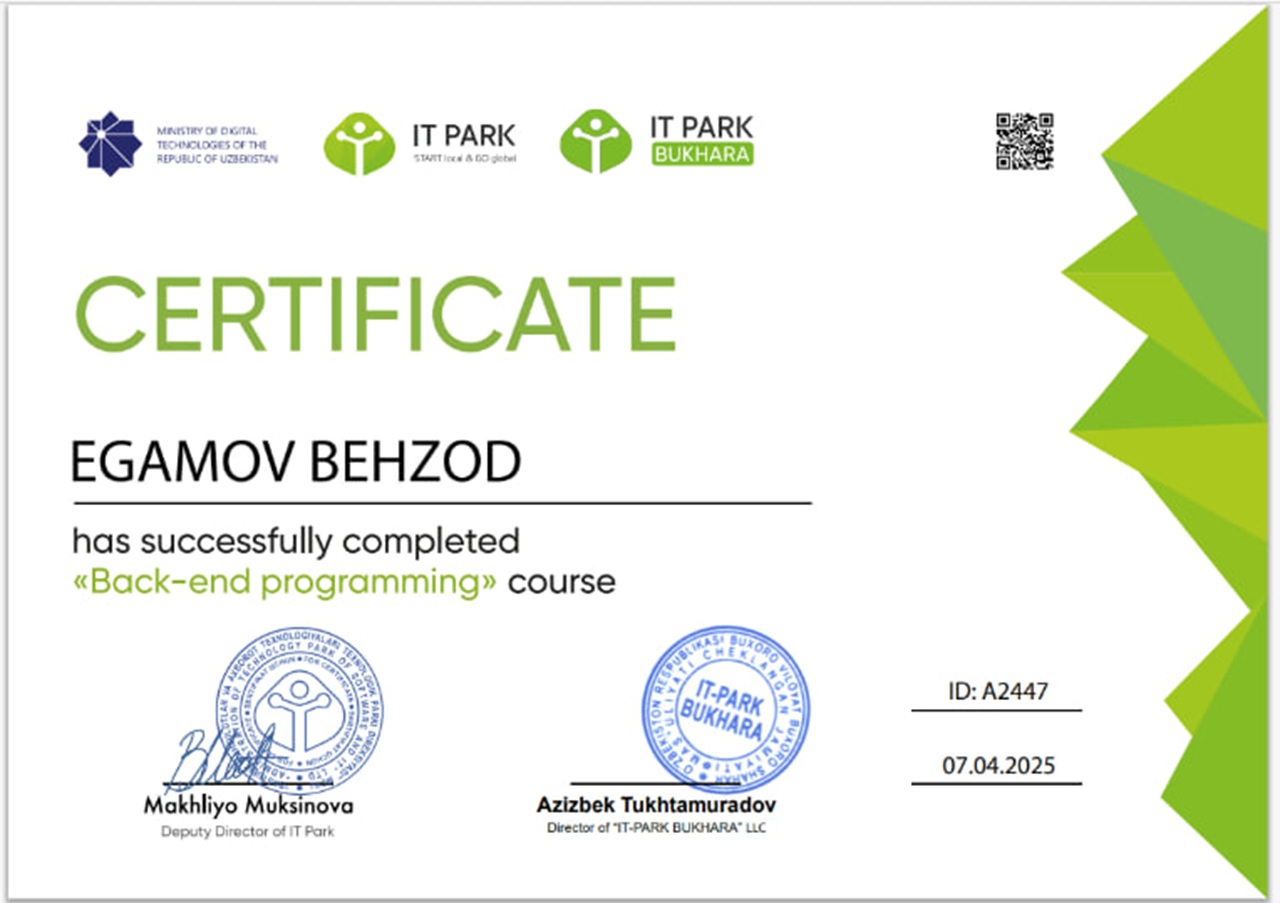 Yoshim 25 da. Men 1 yildan ortiq vaqt mobaynida Web dasturlashda ishlab kelmoqdaman. IT center O'quv markazida Web dasturlashning beckend yo'nalishi bo'yicha tahsil olganman